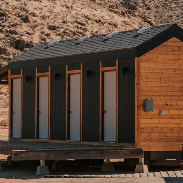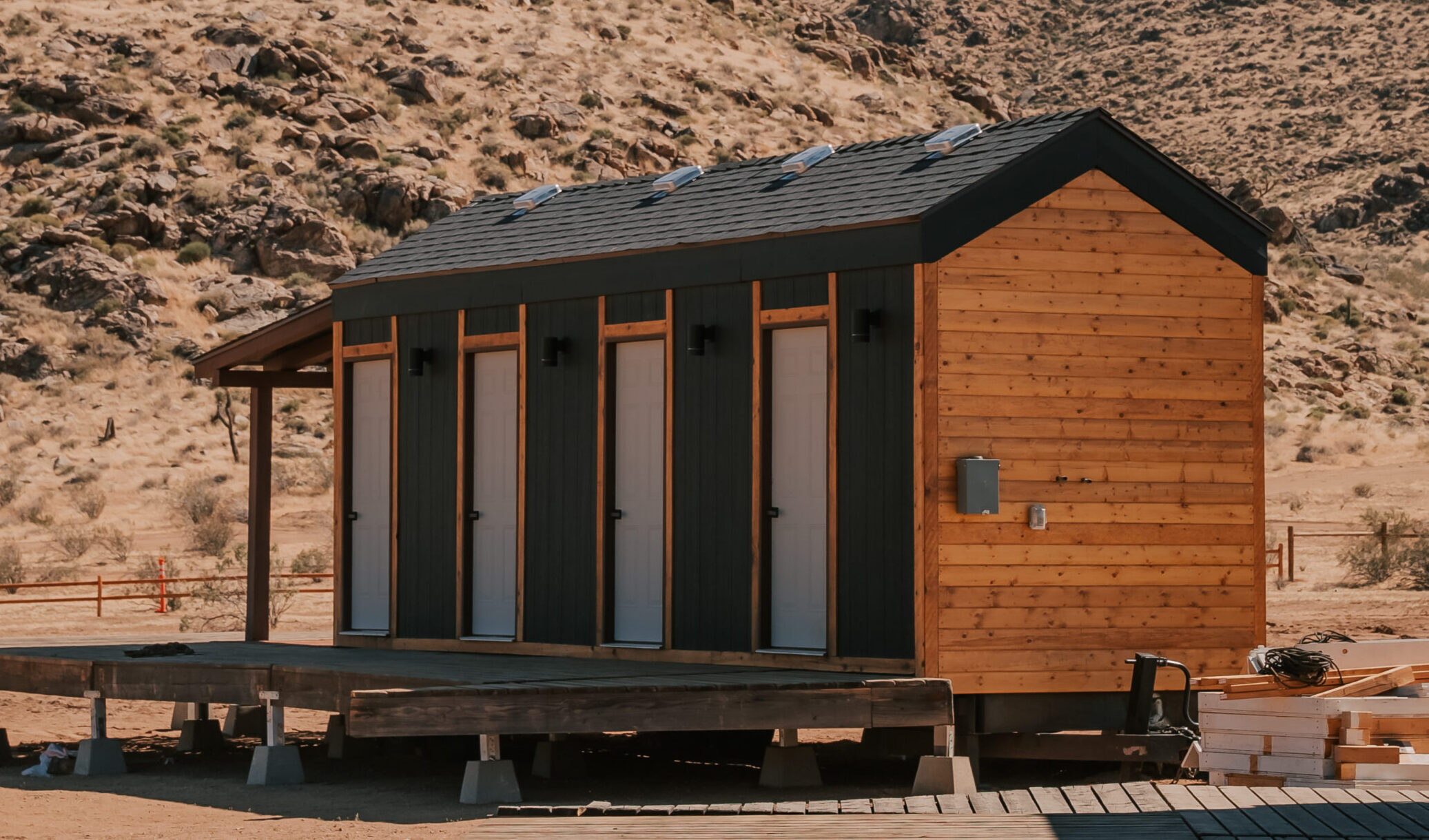 Modern, freestanding sauna units โ available in wood-fired or electric options for a spa-like escape. Off-grid, multi-stall restrooms for remote setups