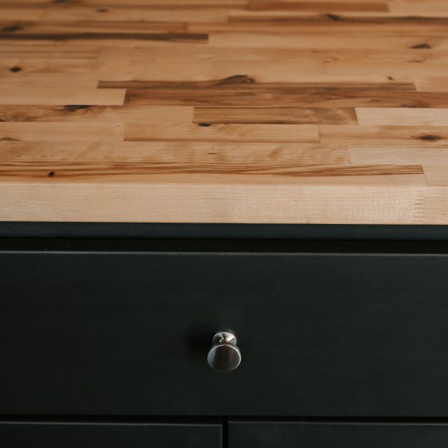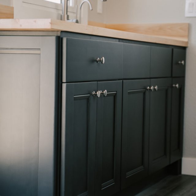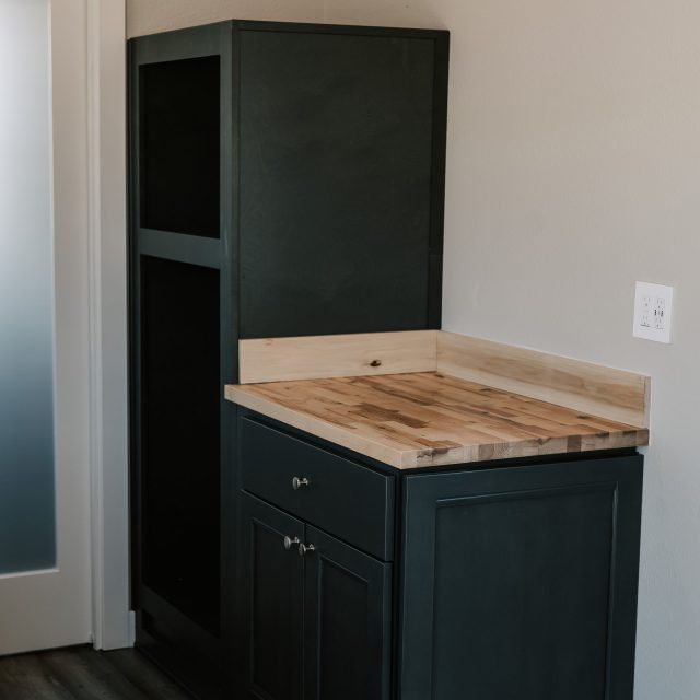 Kitchen: Butcher block countertop, galley kitchen (shaker cabinets), tankless water heater connection, sink with faucet, space for 24″ refrigerator, 2-burner electric induction cooktop, smoke/carbon monoxide alarm.